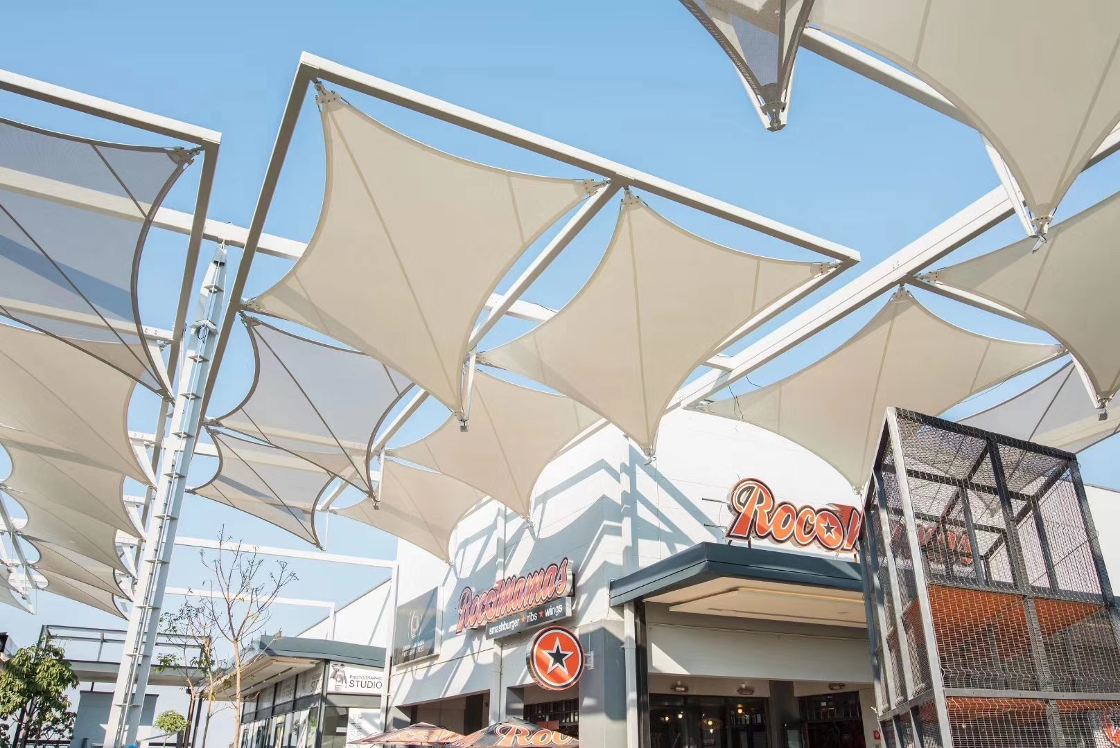 常见于体育场馆看台遮阳、商业步行街雨棚、景观膜结构、充气玩具、环保池体覆盖、临时建筑等,尤其适合对成本敏感且设计灵活度要求较高的项目